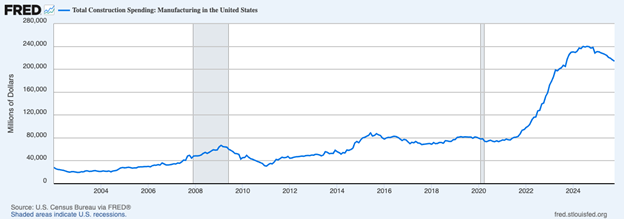 A key metric to watch in the manufacturing sector is construction spending, which peaked in 2024 and has been in a steady decline over the past year. For companies to invest in new plants and domestic growth projects, there needs to be multi-year certainty of the viability of the plans, which has been difficult for many companies in the face of inconsistent tariff policy.
