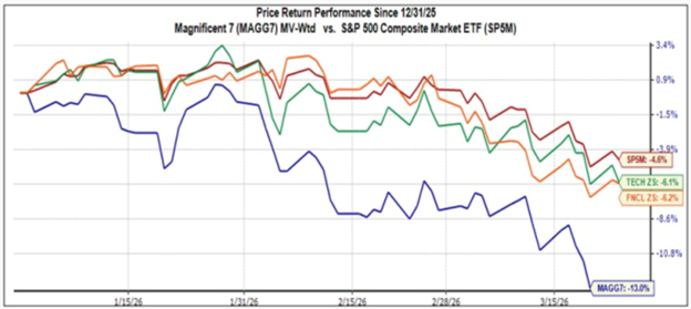 My case-in-point this week: the growing gap between the market’s largest growth stocks and the broader index. As shown below, the once-heralded names in Technology and the “Magnificent Seven” have declined significantly more than the S&P 500 overall in 2026, with drawdowns approaching three times the magnitude of the broader market.