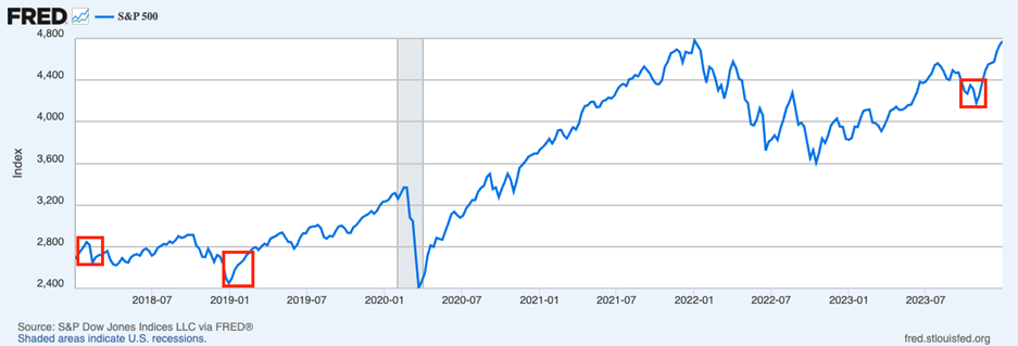 In fact, stocks have risen more often than not during shutdowns, and in the majority of cases, they were higher in the months immediately after. I offer readers a visual breakdown of the three most recent shutdowns, which took place in early 2018, late 2018/2019, and October 2023. The longest shutdown on record, the 35-day episode in late 2018 into 2019, coincided with a strong equity rally as seen below.
