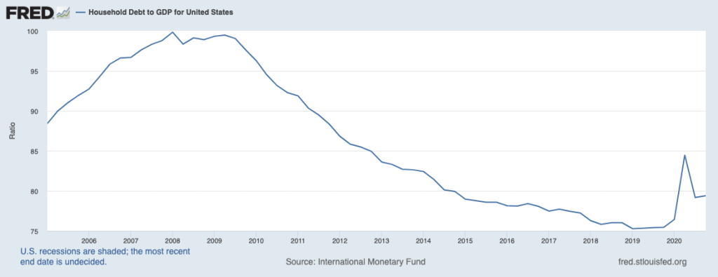 According to the Federal Reserve Bank of New York, consumers on average only spent about a third of each stimulus check, with many households either saving their money, paying down debt, or both. The key conclusion from the NY Fed’s surveys is that consumers have their strengthened balance sheets over the last year, which when combined with a full economic reopening, could support strong spending trends over the next year and beyond.5 Real (adjusted for inflation) disposable personal incomes are at all-time highs (first chart below), and household debt-to-GDP in the U.S. is still at a low level relative to the pre-2008 expansion (second chart).