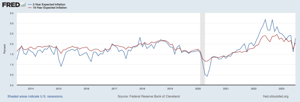 Speaking more generally, TIPS pay around 2% plus the inflation rate over the life of the bond. If inflation ends up being much higher than most expect, then your principal at maturity will also be nicely higher. If the opposite occurs, you likely won’t receive much above your original principal. So, what you’re assuming with a TIPS is that inflation is going to run hotter for longer, which is not necessarily a foregone conclusion. As seen in the chart below, market expectations for inflation in the next 2- and 10-year periods are relatively low: