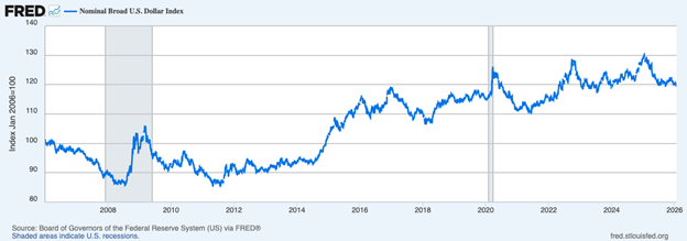 A second point to emphasize is just as important: the dollar moves in cycles. It strengthens and weakens over time as growth, interest-rate differentials, and global capital flows shift. Markets and the economy have proven capable of performing well in either environment. A stronger dollar can weigh on exporters and multinationals, but it also boosts purchasing power and can help dampen inflation. A weaker dollar can support exports and overseas earnings, while raising the cost of imports and some commodities. The effects are real, but they cut both ways. For investors, the key takeaway is perspective. Currency moves can influence which sectors benefit at the margin, but they don’t dictate market direction. History offers plenty of examples of strong equity performance during periods of both dollar strength and dollar weakness. That’s why the more durable drivers—earnings, economic growth, and financial conditions—tend to matter far more than day-to-day currency moves.