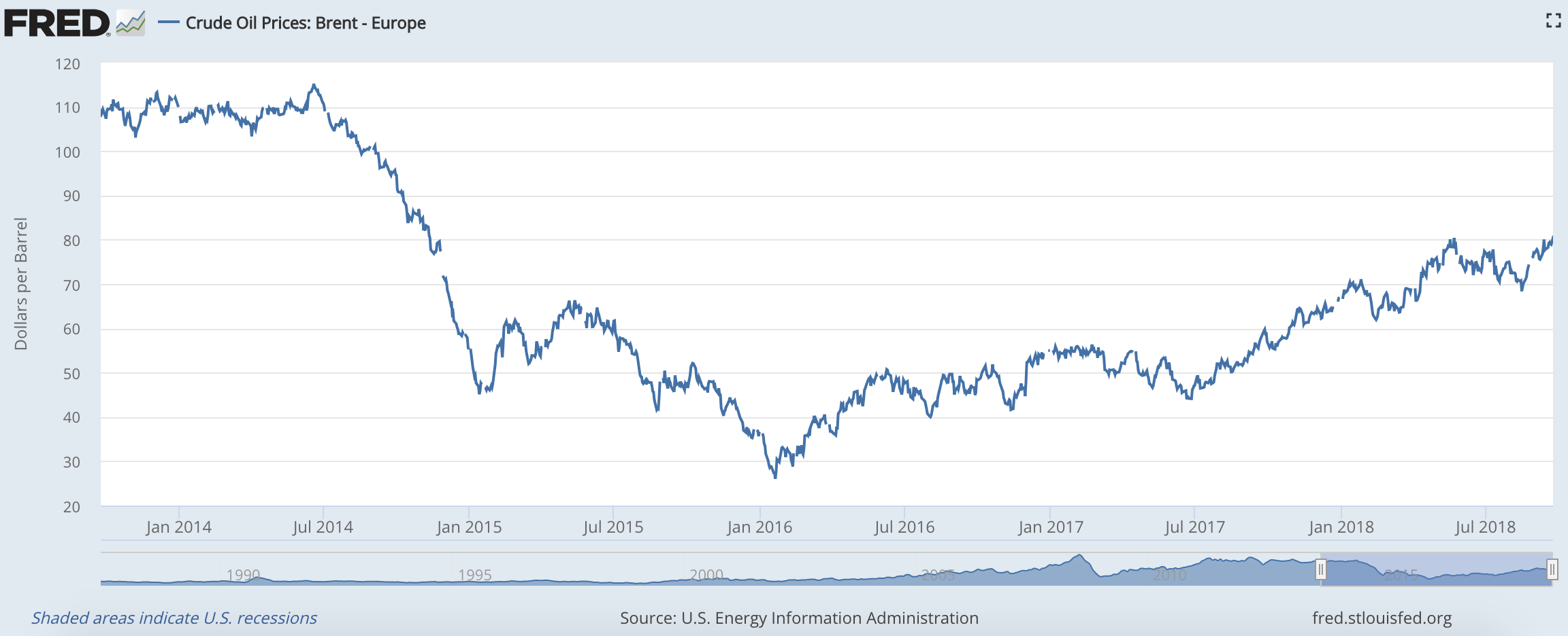 Rising oil prices have just started to gain attention in the media narrative, but still remain off the radar screens of many investors. Perhaps it’s time to pay a bit more attention – Brent Crude oil prices crossed into multi-year high territory last week, and traders seem to be betting that U.S. sanctions on Iran and lower output from embattled countries like Venezuela and Libya will lead to supply shortages. The question of whether Saudi Arabia can fill the supply gaps seems uncertain at best, and is perhaps the catalyst for global oil prices being up some 25% on the year[2]: