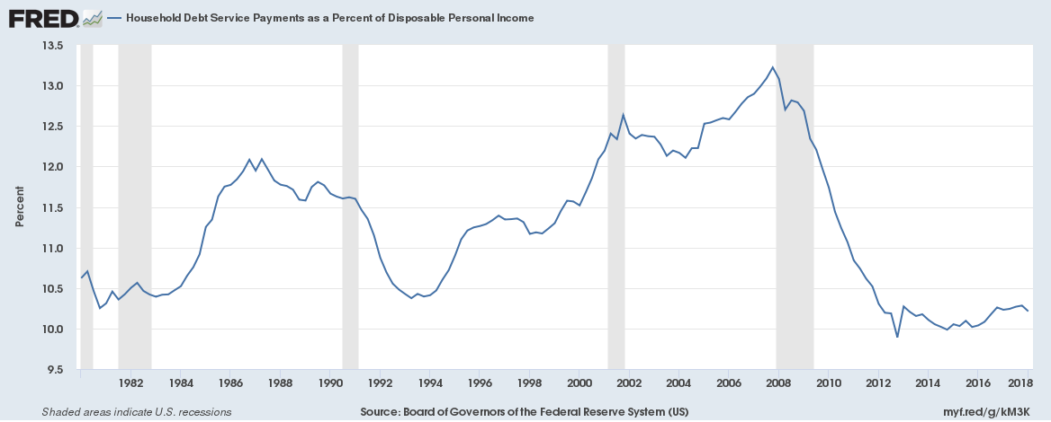 American households appear to have learned our lesson from the crisis. Leading up to the crisis, Americans debt service payments as a percent of disposable income was too high, nearing 14%. Today that number is down to a little over 10%, signaling that households are far less leveraged than they were pre-crisis. One item to note (and to keep an eye on), however, is that while households and banks have cut back on leverage, corporations and the U.S. government have gone the other way.[5]