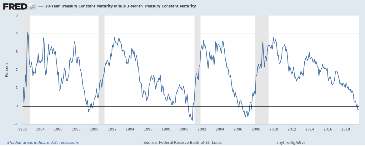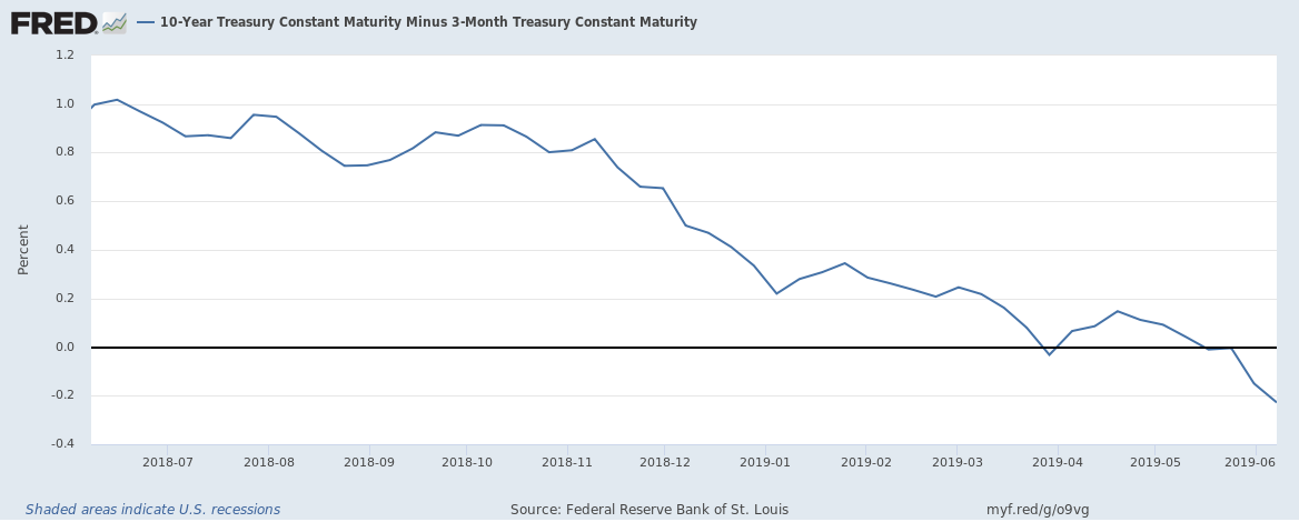 When looking at the difference between the 10-year U.S. Treasury and the 3-month T-bill, the yield curve is officially inverted:[2]
