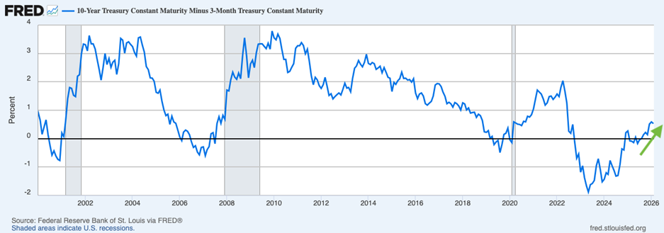 The yield curve steepening is a constructive development, and it fits with a broader picture of an economy that has generally been healthier than appreciated. Equally important, the past two years showed that growth and lending will not always grind to a halt simply because the curve is inverted, reminding us that many other forces are at work.